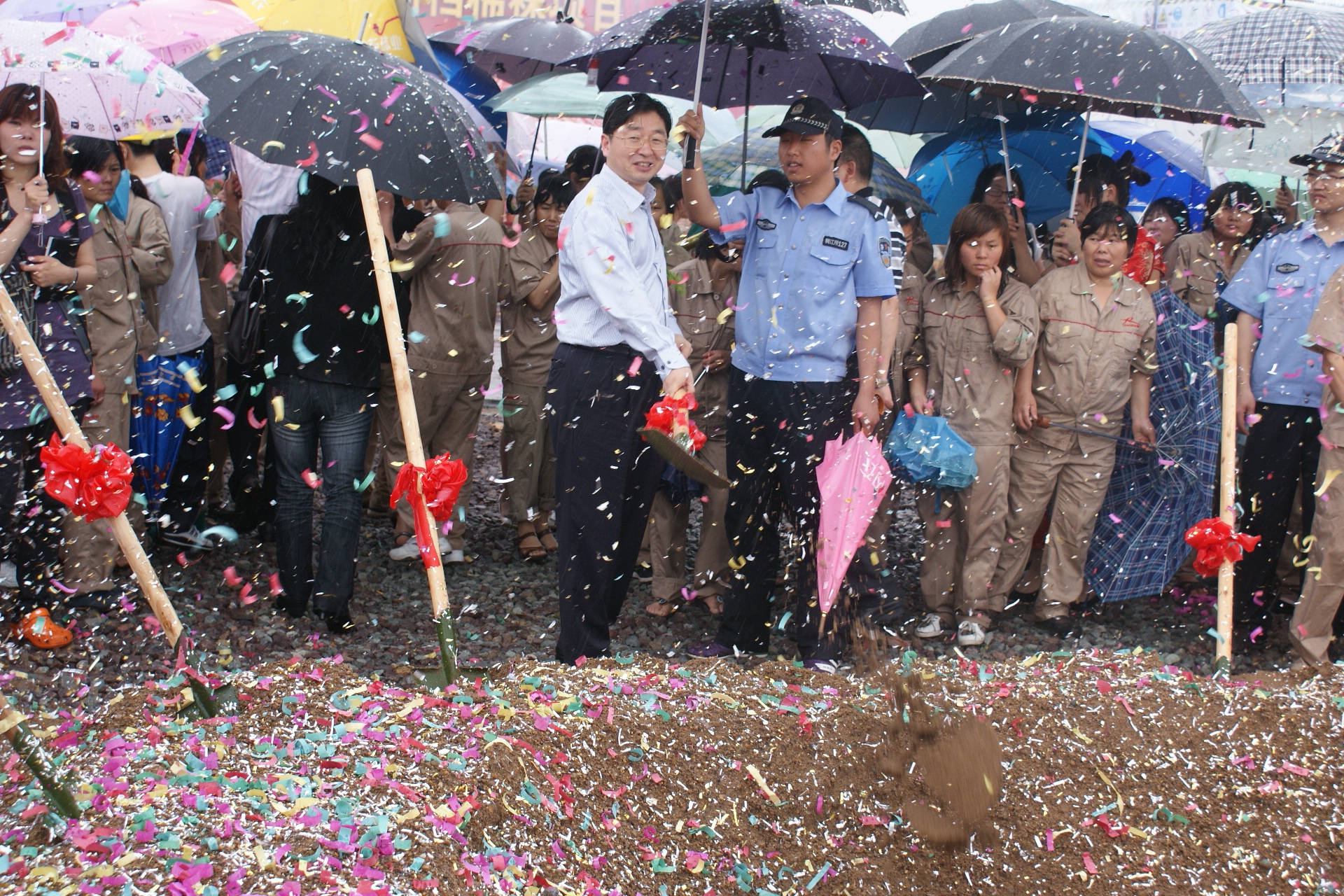 整个开工及奠基仪式在风雨中进行,现场礼炮与礼花齐放,四期所有员工到现场助阵,预示着公司发展的“风调雨顺”。