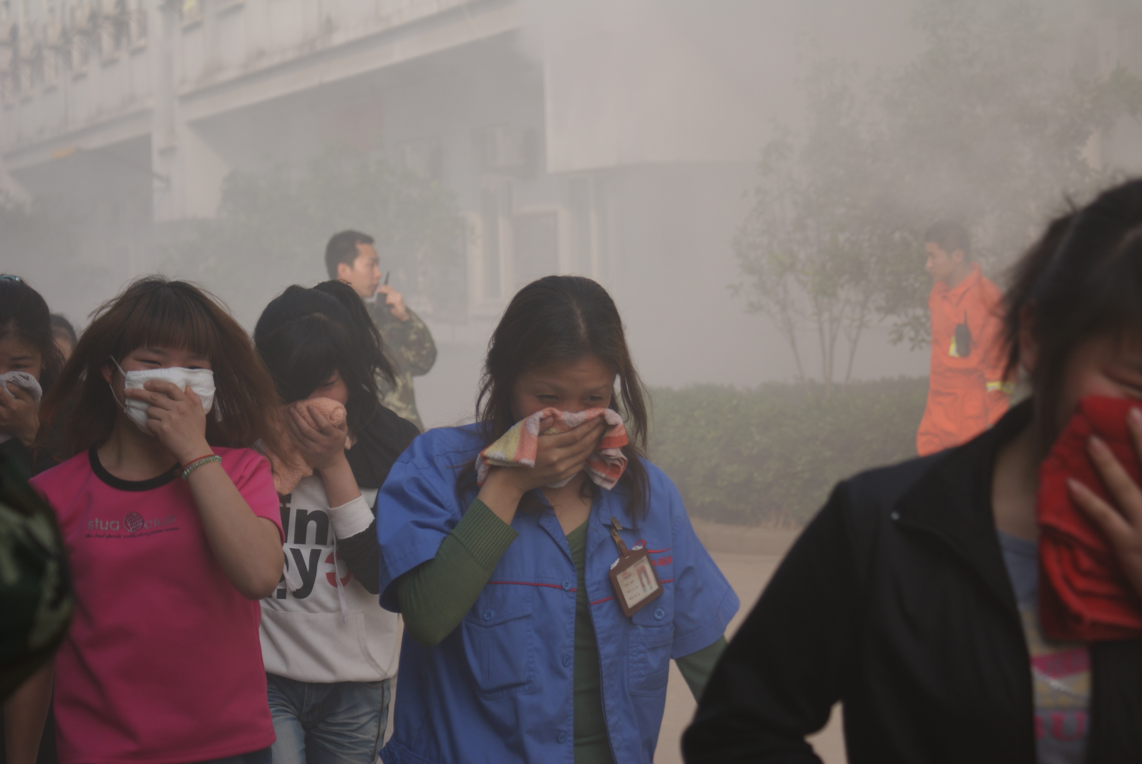 灭火的同时,营救工作有序展开。大量被困者首先在营救人员的指导下,用湿毛巾捂住鼻子,从浓烟中冲出来,转移到安全地带;宿舍楼侧方,消防队员迅速布置好2米多高的气垫,被困者在营救人员的帮助下从三楼窗口顺着绳索成功降落在安全气垫上面;三名男员工在二楼的窗口用力的摇着手中的毛巾向消防队员求救,一分钟后他们便搭乘云梯成功获救;一名绿衣女孩躺在担架上一动不动,直到呼吸了新鲜空气才苏醒过来!最后离开火场的是被困在5楼天台的20多名员工,其中一位女员工因为受到浓烟熏呛几乎窒息,幸好两名消防队员赶到为她戴上防毒面罩。为了不让大家在浓烟中走散,两名消防队员一个在前方带路,另一个殿后,被困人员抓住牵引绳,一个跟着一个走在他们中间。逃出宿舍楼后,大家终于松了一口气!