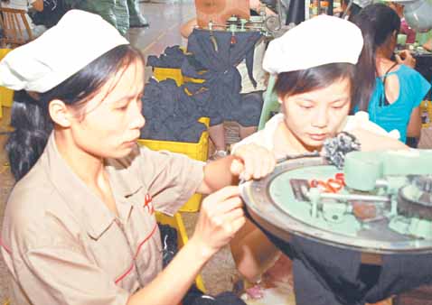 昨日,浪莎控股集团对目车间的邵紫红(左)、邵紫敏(右)姐妹俩正在缝制袜口。今年28岁的邵紫红和25岁的邵紫敏是江西广丰人,2002年双双被招入浪莎控股集团对目车间。进厂后,姐妹俩刻苦学习,努力工作,练就了过硬的袜子缝口技术,每人日均缝制袜口800双,相当于2.5个工人的生产量,而且质量全部达标。如今,姐妹俩人均月收入超过4000元,成了浪莎集团的生产标兵。