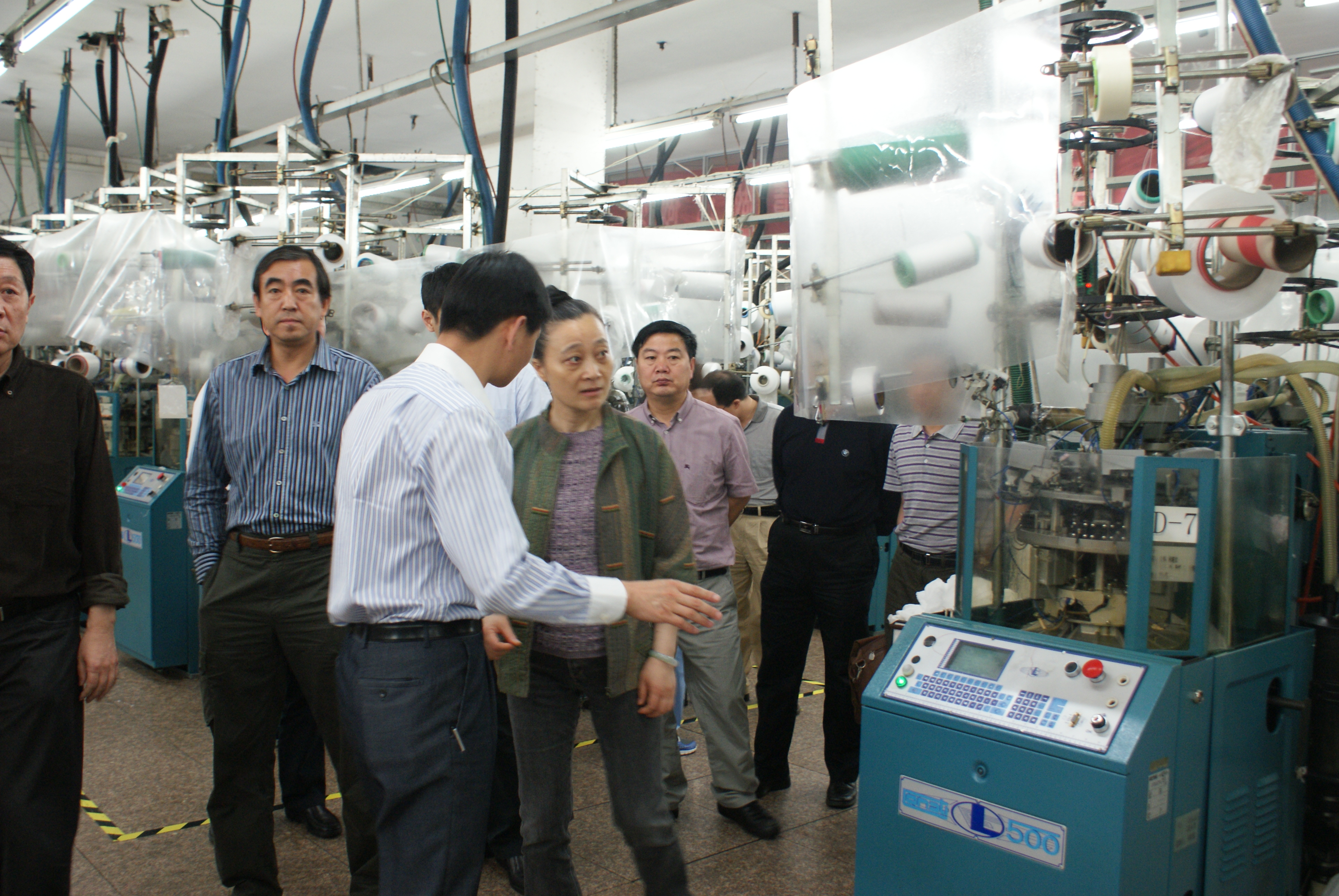 随后,在翁总的陪同下,大家参观了丝袜织造车间。在织造车间,我们可以更加亲密地接触到产品。一根根纱线被送进袜机中,出来时已经变成雪白的半成品。联想到在展示厅里看到的20年代以来的手工袜机,大家都为当今科技投入生产带来的变化而感叹。